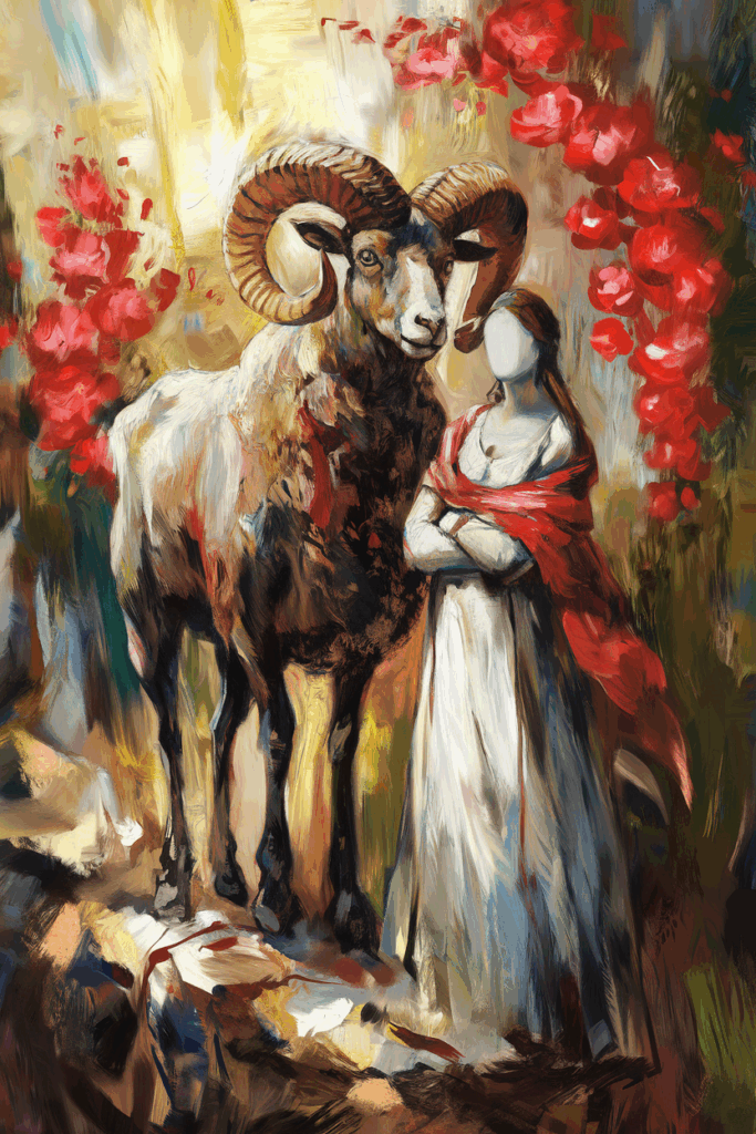 Debout sous l’aurore des possibles ardents,Elle défie le monde de son regard brûlant.Sa robe écarlate comme le sang de la terreÉpouse le contour de son âme guerrière. Près du bélier royal, elle se tient sans crainte,Leurs esprits entrelacés dans une alliance sainte.Elle porte en son cœur la force primitive,Cette flamme première, sauvage et vive. Femme-Bélier, […]