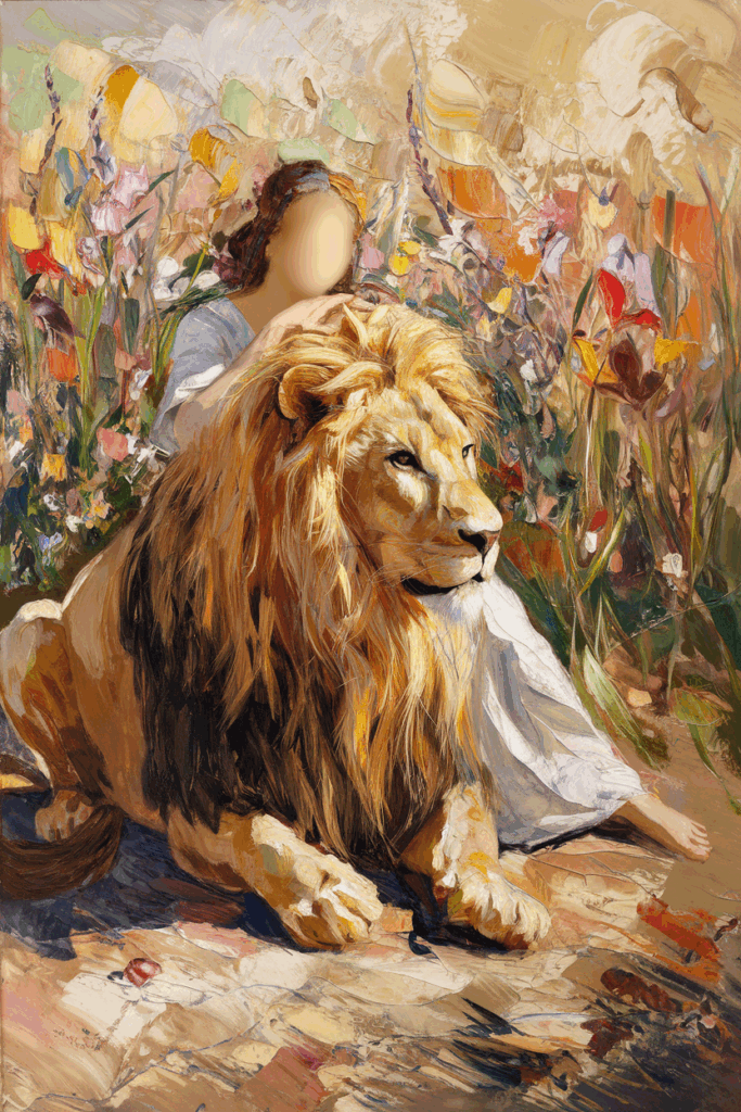 Dans un jardin d’été aux mille fleurs écloses,Elle repose, sereine, tel un bouquet de roses.Sa présence sublime près du fauve royal,Irradie tout l’espace d’un éclat festival. Femme-Lion, ta chevelure est un soleil ardent,Ta lumière se répand comme un or abondant.Ta force ne rugit pas, elle rayonne et charme,Comme l’astre éclatant qui nous prête ses armes. […]
