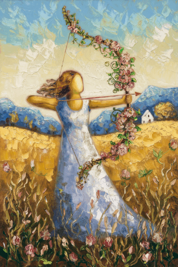 Dans les champs dorés sous le vaste horizon,Elle tend son arc vers une lointaine vision.Sa robe azurée flotte comme une voile,Tandis que son âme s’élance vers les étoiles. Femme-Sagittaire, ton esprit est un vent,Qui souffle, indomptable, libre et conquérant.Ta flèche fleurie vise la vérité pure,Au-delà des limites, des peurs, des murmures. Jupiter t’a offert sa […]