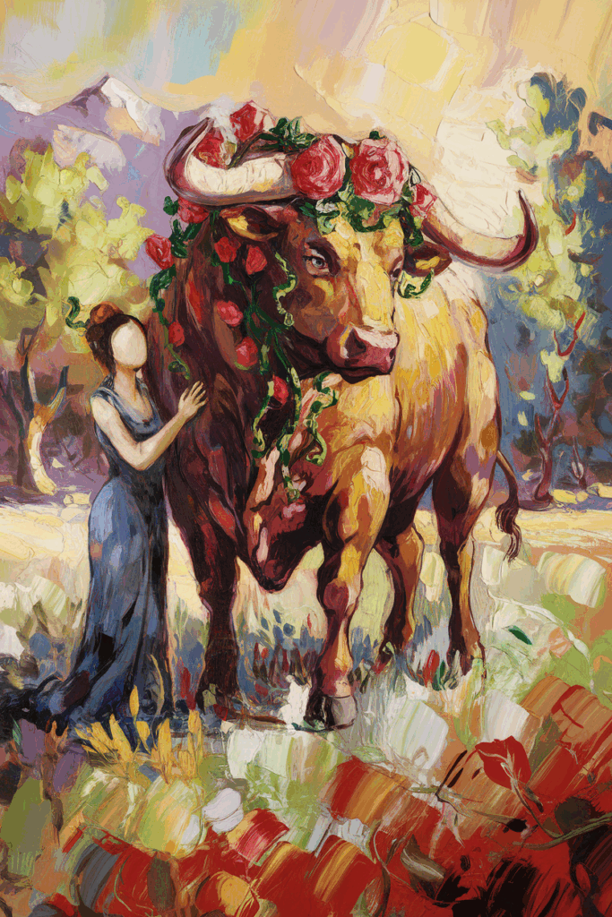 À ses côtés se dresse le puissant taureau,Couronné de roses au parfum enchanté.Sa présence est force, son corps un tableauOù s’inscrit la terre dans sa pérennité. Femme-Taureau, ta main sur sa fourrure épaisseRévèle cet ancrage qui fait battre ton cœur.Ta robe d’azur ondule avec souplesse,Tandis que ton âme cultive la lenteur. Tu es patience, constance […]